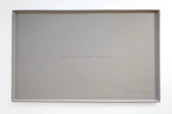 "Feel the Love, Feed the Love" in reliëf in het midden van de mat.